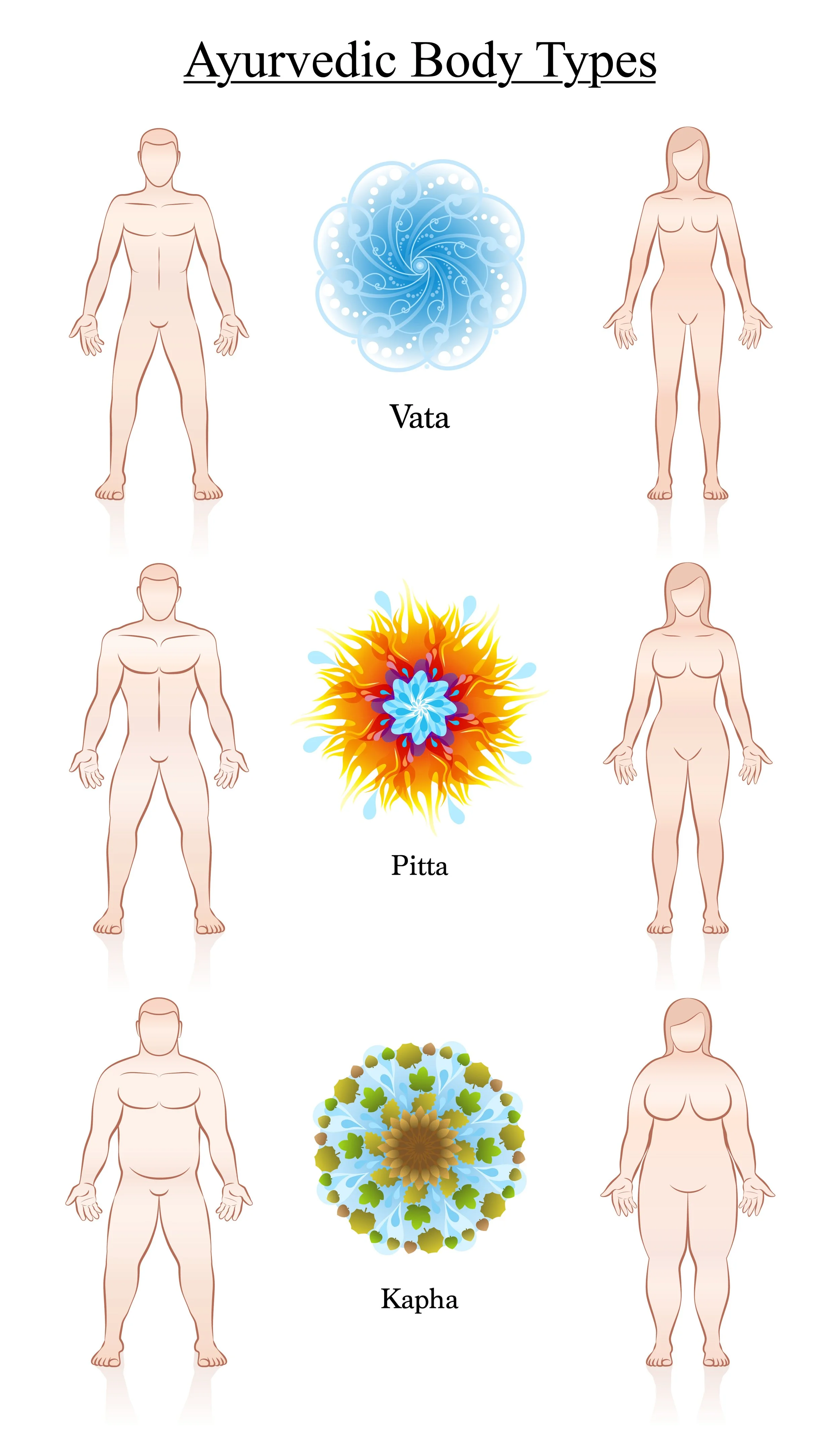 A combination of these ayurvedic elements make up what are known as the three humors, also called constitutions or energies, of the body. Constitution varies by individual, and per ayurvedic philosophy, it may influence how well your body functions during specific times of the year.